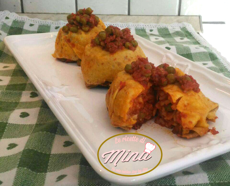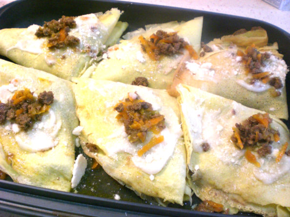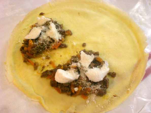 Mettiamo una parte di carne cotta sulle crepes come da foto.