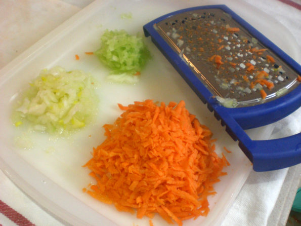 Le verdure vanno grattugiate grossolanamente e va messa a scolare la mozzarella, in modo da eliminare tutta l’acqua in eccesso.