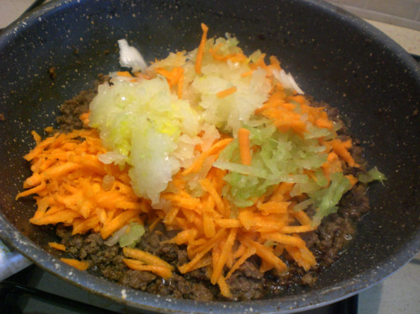 Cuocete per 5 minuti il macinato e aggiungete le verdure sopra con l’olio e il sale terminate la cottura.