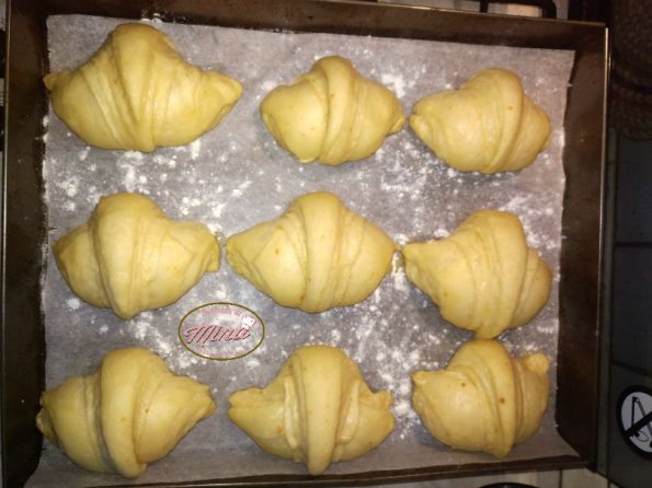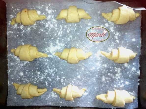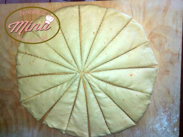 Tagliate a spicchi come vedete ne escono 16 e arrotolate per dare la forma del cornetto.