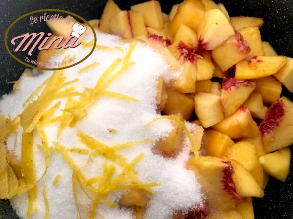 Pesche lavate, pulite e capate, private del nocciolo e fatte a pezzettoni.