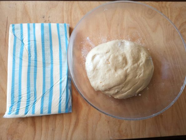 Chiudiamo prima una parte e poi l’altra schiacciando con un matterello per far aderire e lasciare 30\40 minuti a lievitare di nuovo, coperto con un canovaccio.