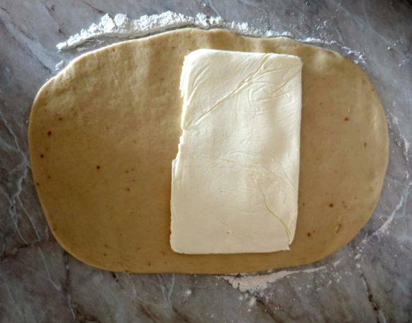 Una volta trascorso il tempo riprendiamo l’impasto e formiamo un bel rettangolo dove come da foto adageremo il burro.
