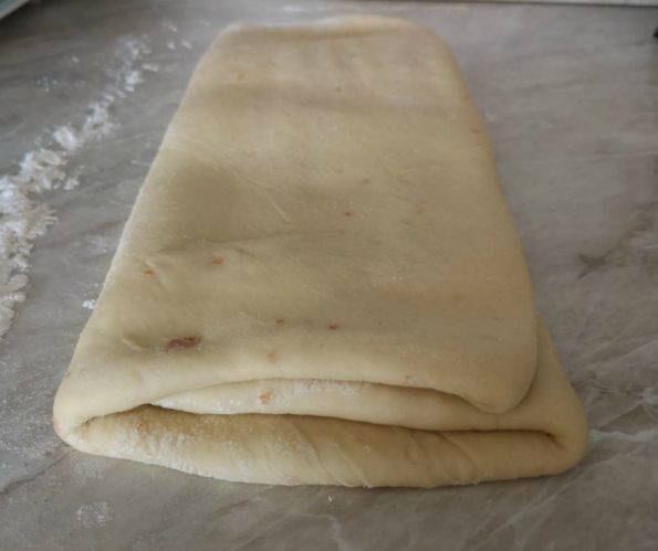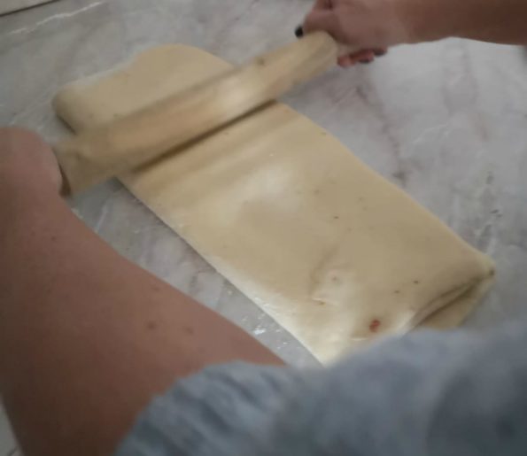 Trascorso il tempo, giriamo il rettangolo e ripieghiamolo di nuovo come precedentemente, con il matterello schiacciamo di nuovo.