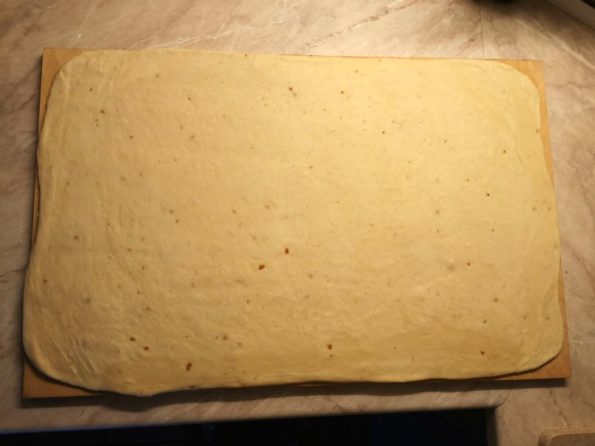 Dopo l’ultima lievitazione realizziamo un rettangolo il più preciso possibile, le dimensioni devono essere 80×50 circa.