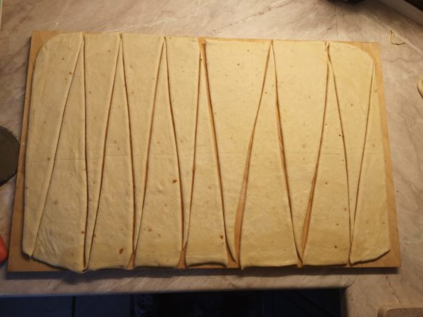 La parte più divertente viene adesso perchè dobbiamo ricavare dai 16 ai 18 triangoli e formare i Cornetti sfogliati con il bimby.