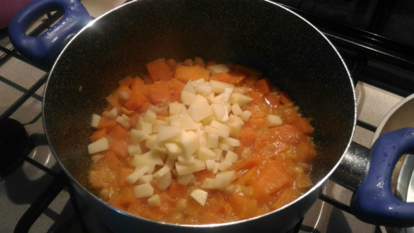 Io uso cipolla sedano e carota, poi pulite la zucca, io l’avevo già pronta in congelatore.
