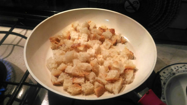 In una padella mettete il pane tagliato a tocchetti, va bene fresco ma anche raffermo.
