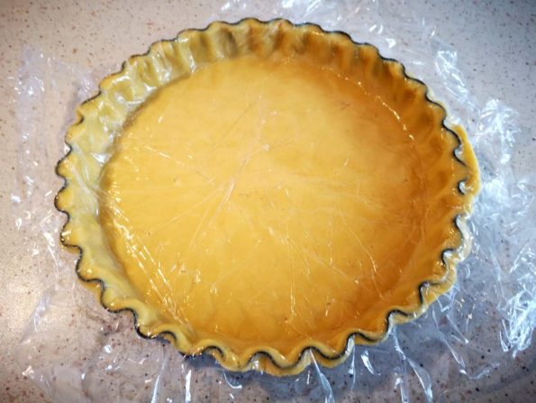 Se vi avanza della frolla potete realizzarci dei biscottini per la decorazione finale ma a me è andata giustissima, se non ci credete eccola qui mentre la modellavo con l’aiuto della pellicola.