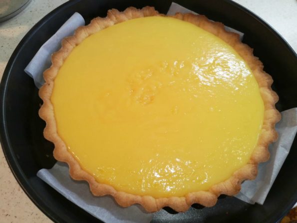 Estraiamo il guscio e poniamo delicatamente in una teglia più grande, poi capirete meglio, e versiamo la lemon curd al suo interno che ormai sarà tiepido.