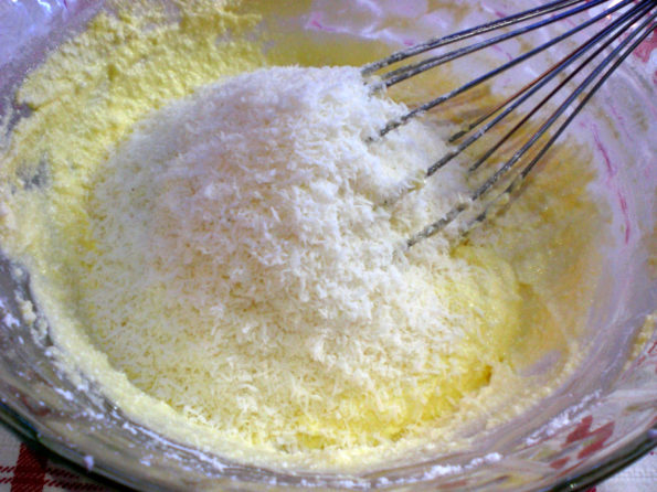 Successivamente aggiungete lo zucchero a velo e solo dopo aggiungete il cocco, la farina disidratata ovviamente.