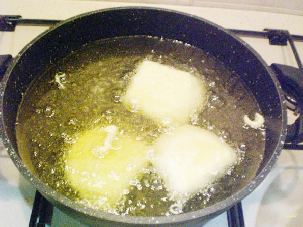 Mettete a soffriggere l’olio, e riprendete la pastella dal frigo, tuffateci i pezzi di formaggio, inzuppateli bene e via nell’olio caldo.