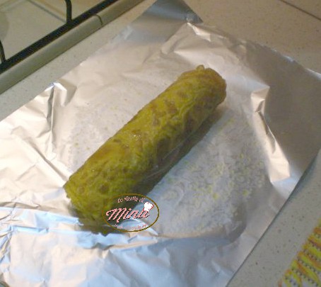 Arrotolate la Frittata farcita anche questo passaggio va fatto veloce e il tutto deve avvenire a frittata davvero calda, infatti come vedete io sono vicino al fornello a lavorare.