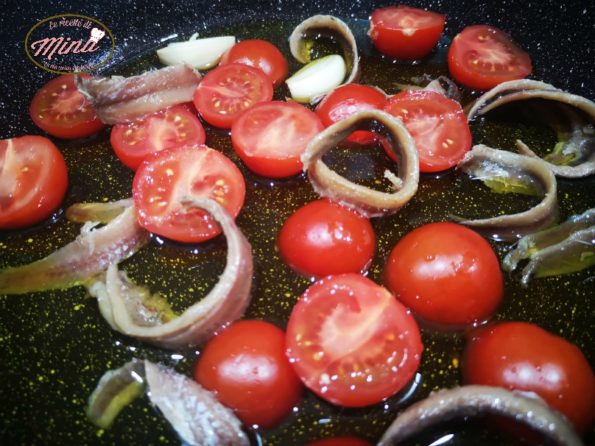 In una casseruola che poi salterà anche la pasta mettiamo i pomodorini, l’olio, le acciughe e l’aglio.