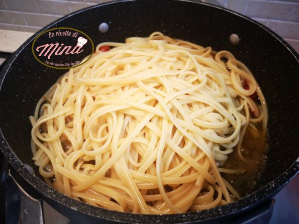 Se volete togliete pure l’aglio e appena la pasta è al dente la scolate acquosa nella casseruola.