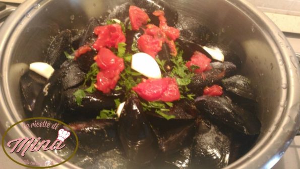 Filtriamo in una garzina sterile il fondo delle cozze e le verisamo anche loro in padella, aggiungiamo i pezzi del pomdoro e eliminiamo invece l’aglio.