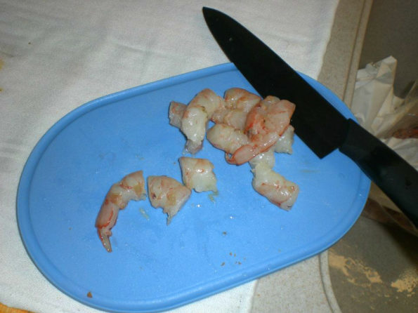 Tagliamoli a pezzi non troppo piccoli, con un gamberone faccio 3 pezzi per intenderci.