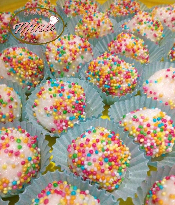 Le mie ricette sono tutte facili, io le ho decorate con dei confettini colorati dovendoli portare ad una festa per bimbi ma se li volete chic usate delle codette al cioccolato o confettini argentati, il risultato davvero elegante vi stupirà. Inoltre essendo monoporzione si mangiano come ciliege, uno tira l’altro.