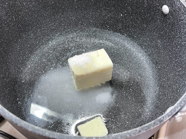 Quindi mettiamo in una pentola a bollire l’acqua con il sale lo zucchero è il burro.