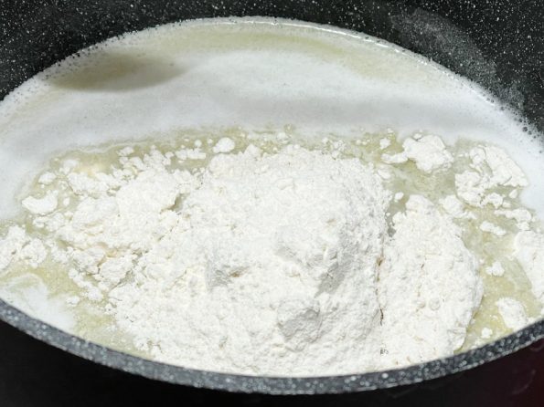 Appena raggiunge il bollore si versa la farina tutta insieme.