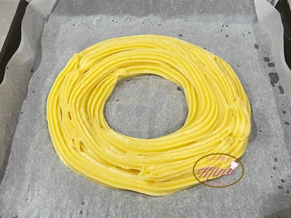 Ho realizzato per il mio Paris brest con le dosi che avete letto sopra una ruota di circa 24 centimetri di diametro.