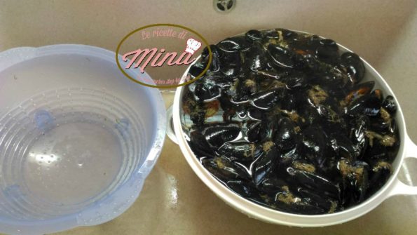 Le cozze le toglieremo dal guscio lasciandone solo qualcuna per la decorazione, la sua acqua che ho fatto volutamente più abbondante la filtriamo usando delle garzine sterili.