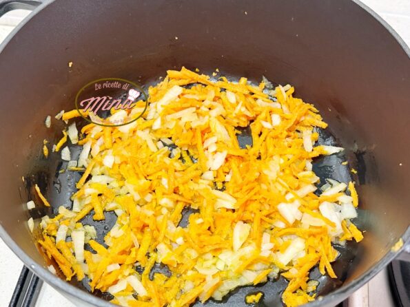 Carote e cipolle, tagliate medio piccole, in pentola con olio ad appassire.