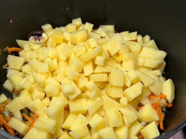 Le patate le abbiamo sbucciate e tagliate a quadrettini medio piccoli.