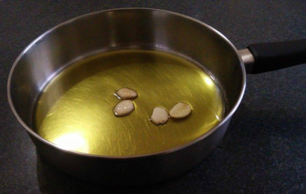 Prendiamo una padella dai bordi alti versiamo l’olio extra vergine di oliva e aggiungete gli spicchi di aglio.