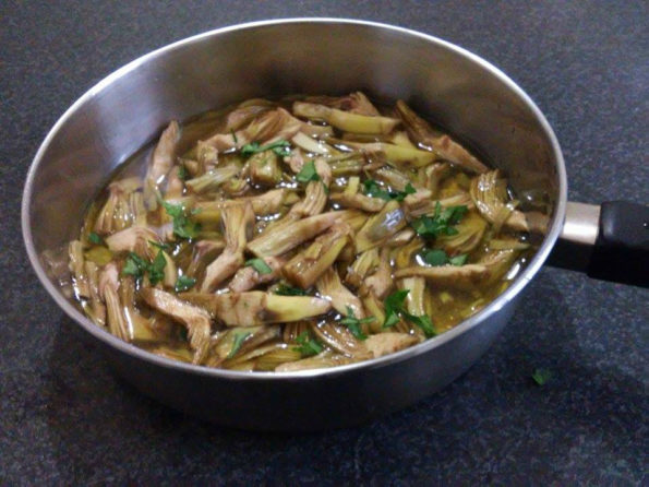 Versiamo e facciamo cuocere i carciofi con l’aiuto dell’acqua e del vino, la cottura dipenderà dalla durezza dei carciofi e da quanto scarto avrete tolto.