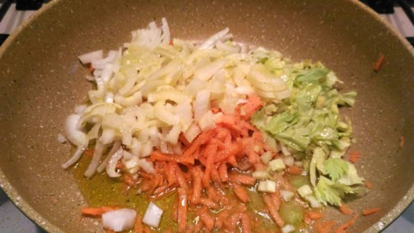 Intanto prepariamo un soffritto con gli odori che avete trovato fra gli ingredienti.