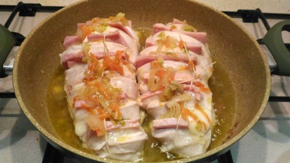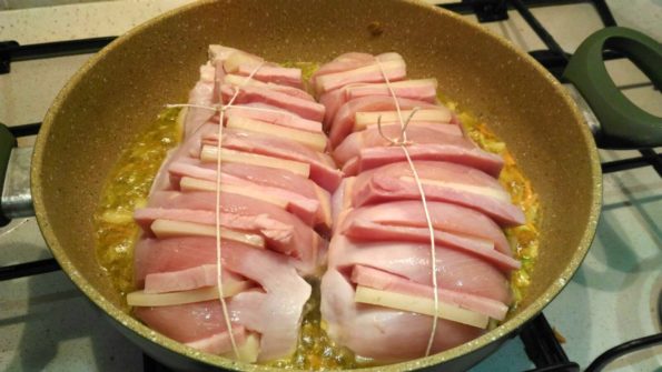 Adagiamo il Petto di pollo farcito, facciamo rosolare a fiamma vivace, poi abbassiamo la fiamma e copriamo.