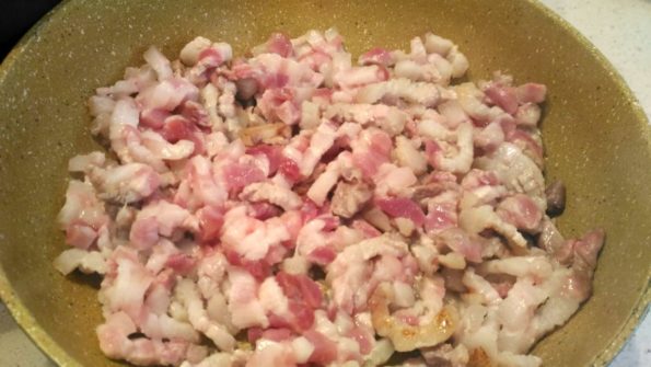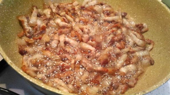 La pancetta fresca di maiale l’ho fatta a listarelle e la metto in una padella ad abbrustolire.