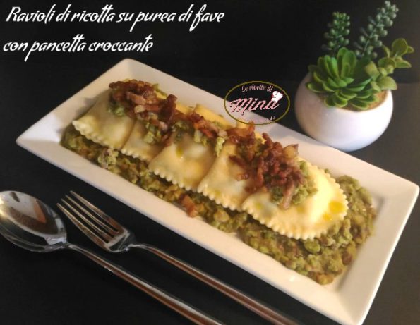 Ravioli di ricotta su purea di fave con pancetta croccante vieni a scoprire come li realizzo.