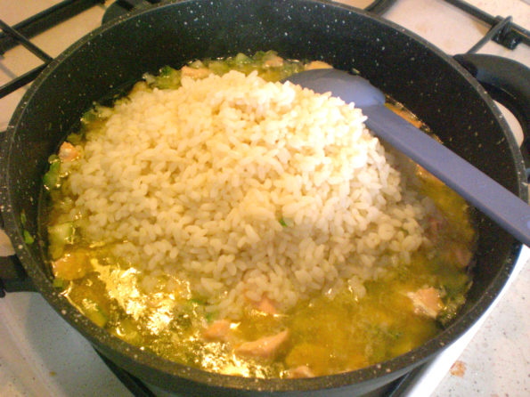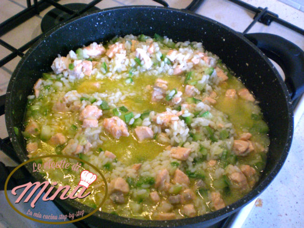 Inoltre con il sughetto della zucchina e del salmone insieme ad un po dell’acqua di cottura del riso potremo finire la cottura del mio Risotto di salmone e zucchine a modo mio.