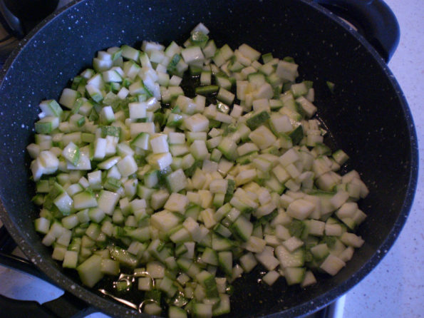 Successivamente in una casseruola tritiamo la cipolla, facciamo la zucchina a cubetti e versiamo l’olio extra vergine di oliva.