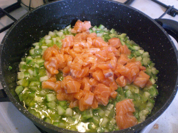 Quando la zucchina sarà a metà cottura aggiungiamo il salmone.