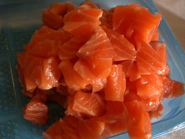 Dunque mentre tutto è in cottura prendiamo il salmone priviamolo della pelle e facciamolo a cubetti di 2 centimetri.
