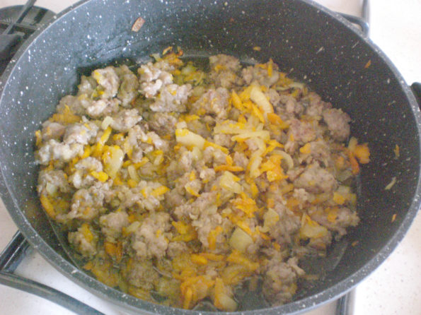In una pentola sbricioliamo la pasta della salsiccia di maiale, affettiamo e tritiamo la cipolla e grattugiamo grossolanamente la zucca. Versiamo un po di olio extra vergine di oliva e portiamo sul fuoco. Lasciamo cucinare a fiamma viva per qualche minuto.