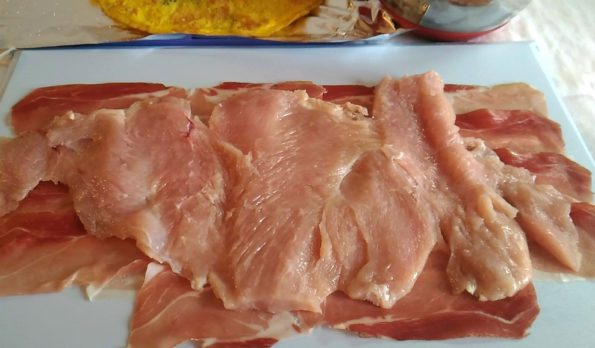 Adagiate sulle fettine di speck il petto di pollo o tacchino, io ho usato quest’ultimo.