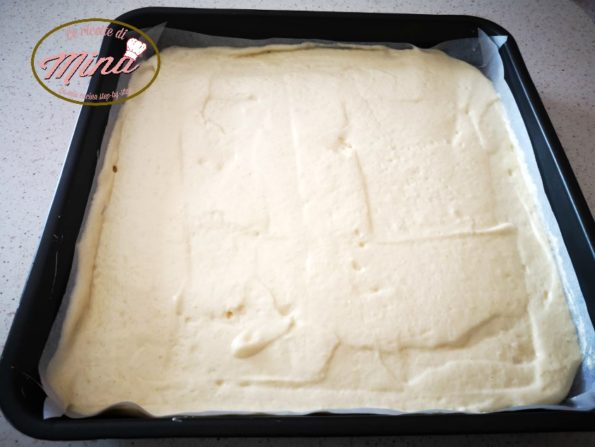 Prendiamo una leccarda quella dei forni standard per intenderci da 60 cm adagiamoci sopra un foglio di carta da forno e spennelliamoci sopra tutto l’impasto del mio Rotolo panna e fragole. Cercate di livellare in modo uniforme.