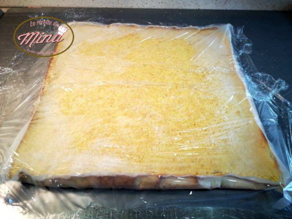 Appena cotto, va subito tolta dalla teglia e poggiata con la sua carta su una superficie fredda, spolverato con dello zucchero semolato in superficie, e coperto con pellicola per almeno 15 minuti.
