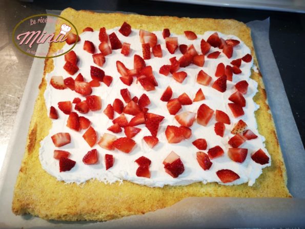 Togliete dalla carta forno e dalla pellicola la nostra base, utilizzate un foglio nuovo di carta forno che vi aiuterà nell’arrotolarlo, adagiatevi sopra non avvicinandovi troppo ai bordi la panna e sopra i pezzi di fragola sparsi.