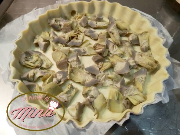 Srotolate la sfoglia e adagiatevi i carciofi a spicchi, sia se sono surgelati che se sono lessi, ricordatevi di bucare la sfoglia con i rebbi di una forchetta.