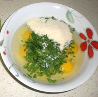 Tagliateli a spicchi,teneteli pronti, rompete le uova e mischiate tutti gli ingredienti fate come se doveste fare una bella frittata.