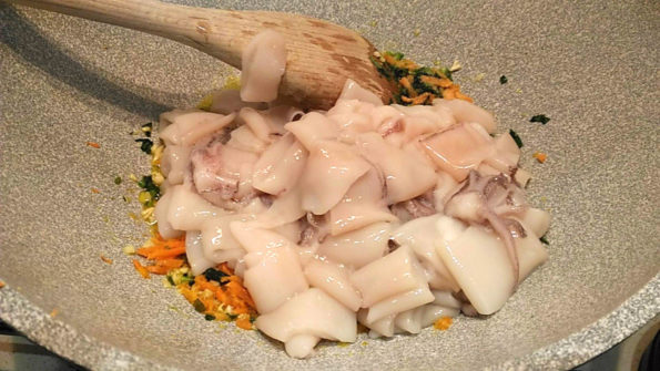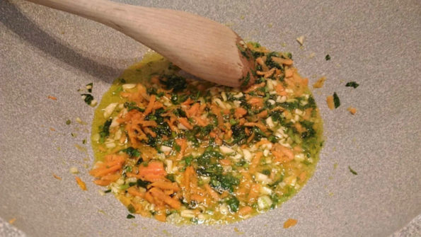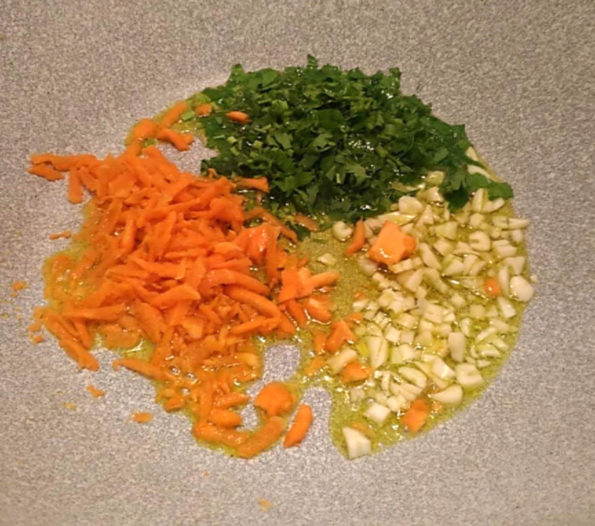 Aggiungiamo l’olio extra vergine di oliva e facciamo leggermente soffriggere.