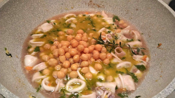 Aggiungiamo il rametto di rosmarino e facciamo andare 2 minuti, poi aggiungiamo i ceci.