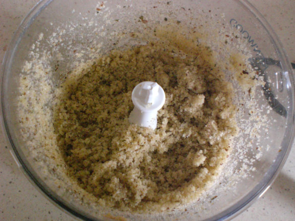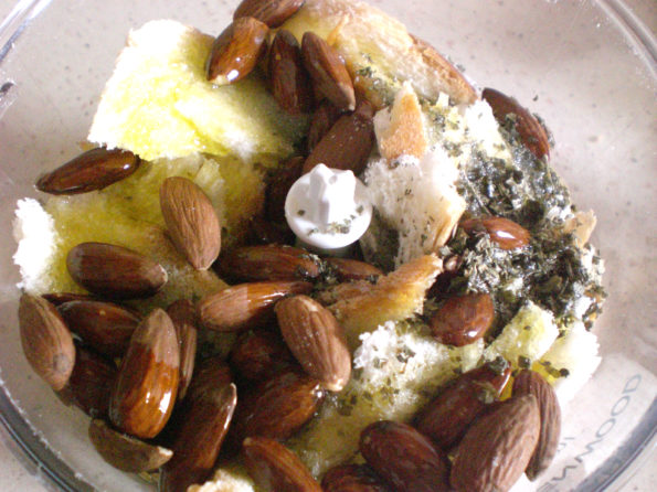 In un mixer unite le mandorle con la pellicina, la mollica del pane sbriciolato, il prezzemolo spezzettato,l’olio extra vergine di oliva e il sale. Frullate e riducete in mollica tritata finemente.