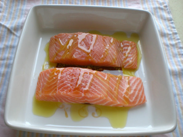 In una pirofila adagiate i due tranci di salmone mettendo un po di olio sotto e sopra il pesce.