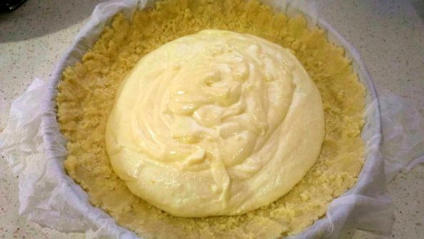 Prendete la metà dell’impasto della sbriciolata e mettete nel fondo della teglia alzando un po i bordi.